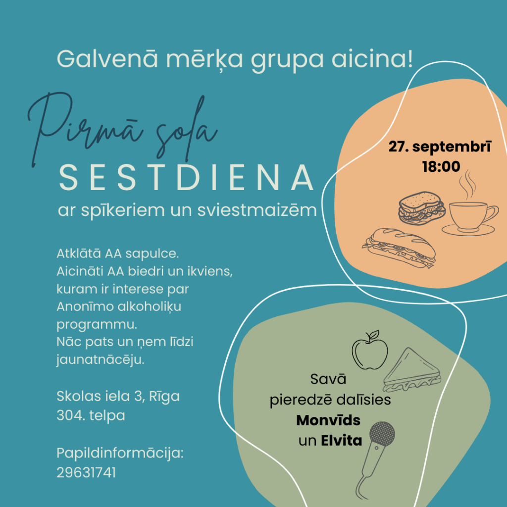 “Pirmā soļa sestdiena” ir atklātā sapulce. Aicināti AA biedri un ikviens, kuru interesē Anonīmo alkoholiķu programma. Īpaši aicināti jaunatnācēji un cilvēki, kas vēl nav pazīstami ar Anonīmo alkoholiķu programmu, bet vēlas pārtraukt dzeršanu, kā arī sponsori ar saviem sponsorējamajiem!