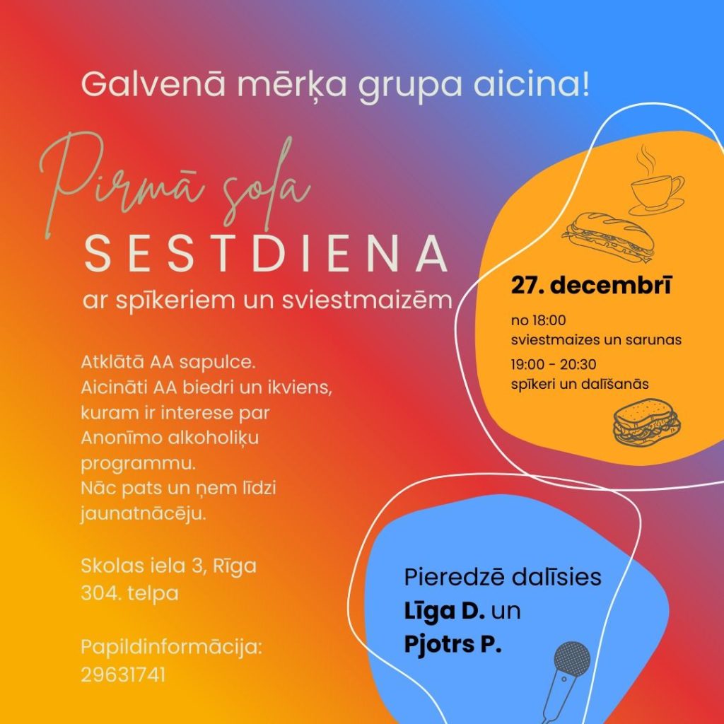 “Pirmā soļa sestdiena” ir atklātā sapulce. Aicināti AA biedri un ikviens, kuru interesē Anonīmo alkoholiķu programma. Īpaši aicināti jaunatnācēji un cilvēki, kas vēl nav pazīstami ar Anonīmo alkoholiķu programmu, bet vēlas pārtraukt dzeršanu, kā arī sponsori ar saviem sponsorējamajiem!