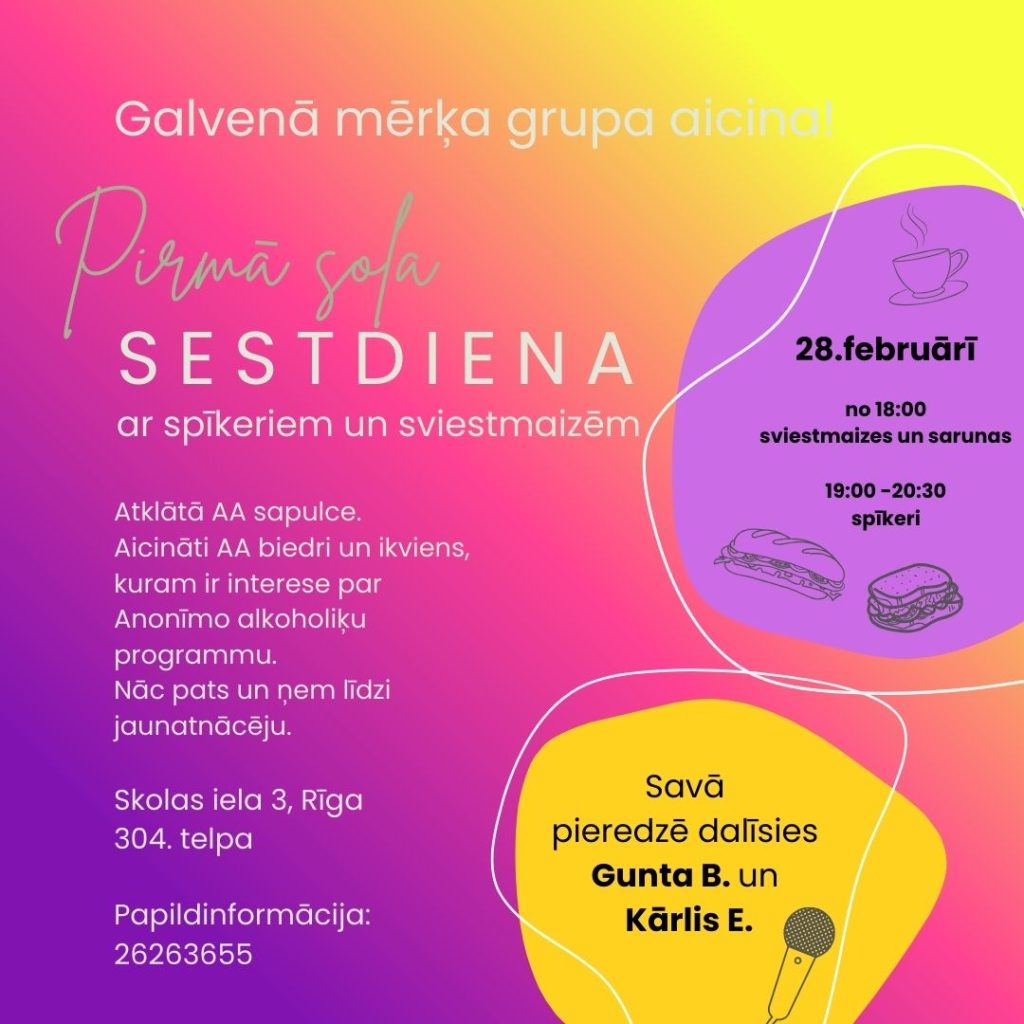 “Pirmā soļa sestdiena” ir atklātā sapulce. Aicināti AA biedri un ikviens, kuru interesē Anonīmo alkoholiķu programma. Īpaši aicināti jaunatnācēji un cilvēki, kas vēl nav pazīstami ar Anonīmo alkoholiķu programmu, bet vēlas pārtraukt dzeršanu, kā arī sponsori ar saviem sponsorējamajiem!