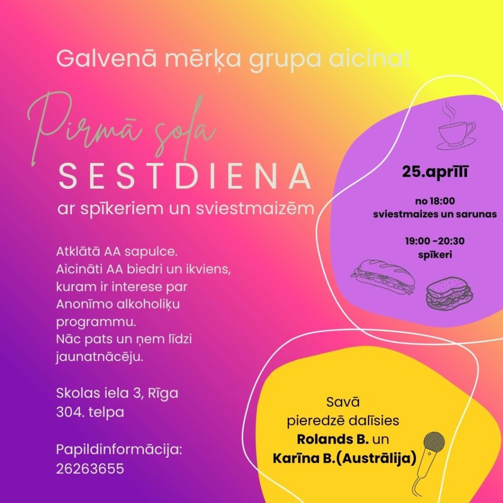 “Pirmā soļa sestdiena” ir atklātā sapulce. Aicināti AA biedri un ikviens, kuru interesē Anonīmo alkoholiķu programma. Īpaši aicināti jaunatnācēji un cilvēki, kas vēl nav pazīstami ar Anonīmo alkoholiķu programmu, bet vēlas pārtraukt dzeršanu, kā arī sponsori ar saviem sponsorējamajiem!